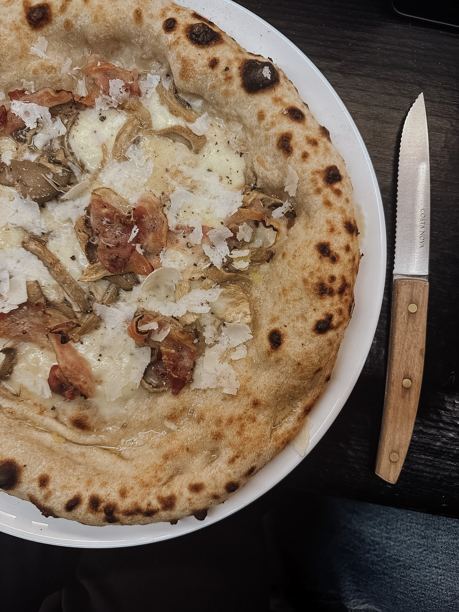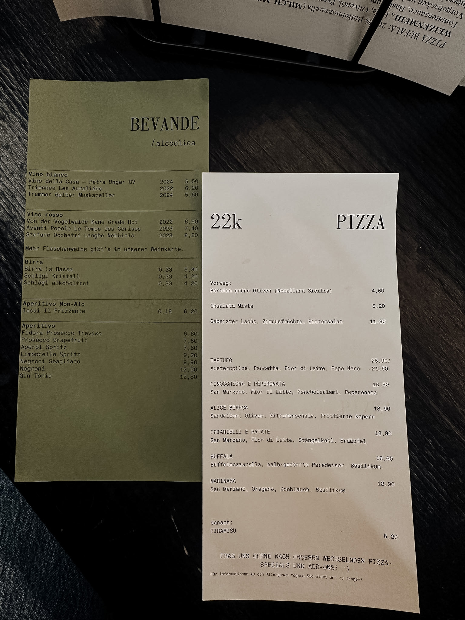 Wir haben zwei Pizza Bianco bestellt: eine mit Kapern, Sardellen und Zitrone – salzig, frisch, richtig gut. Und eine mit viel Trüffel, intensiv und sehr aromatisch. Dazu ein Bier und zum Abschluss ein Tiramisu, das definitiv einen Platz auf der Bestellung verdient.
