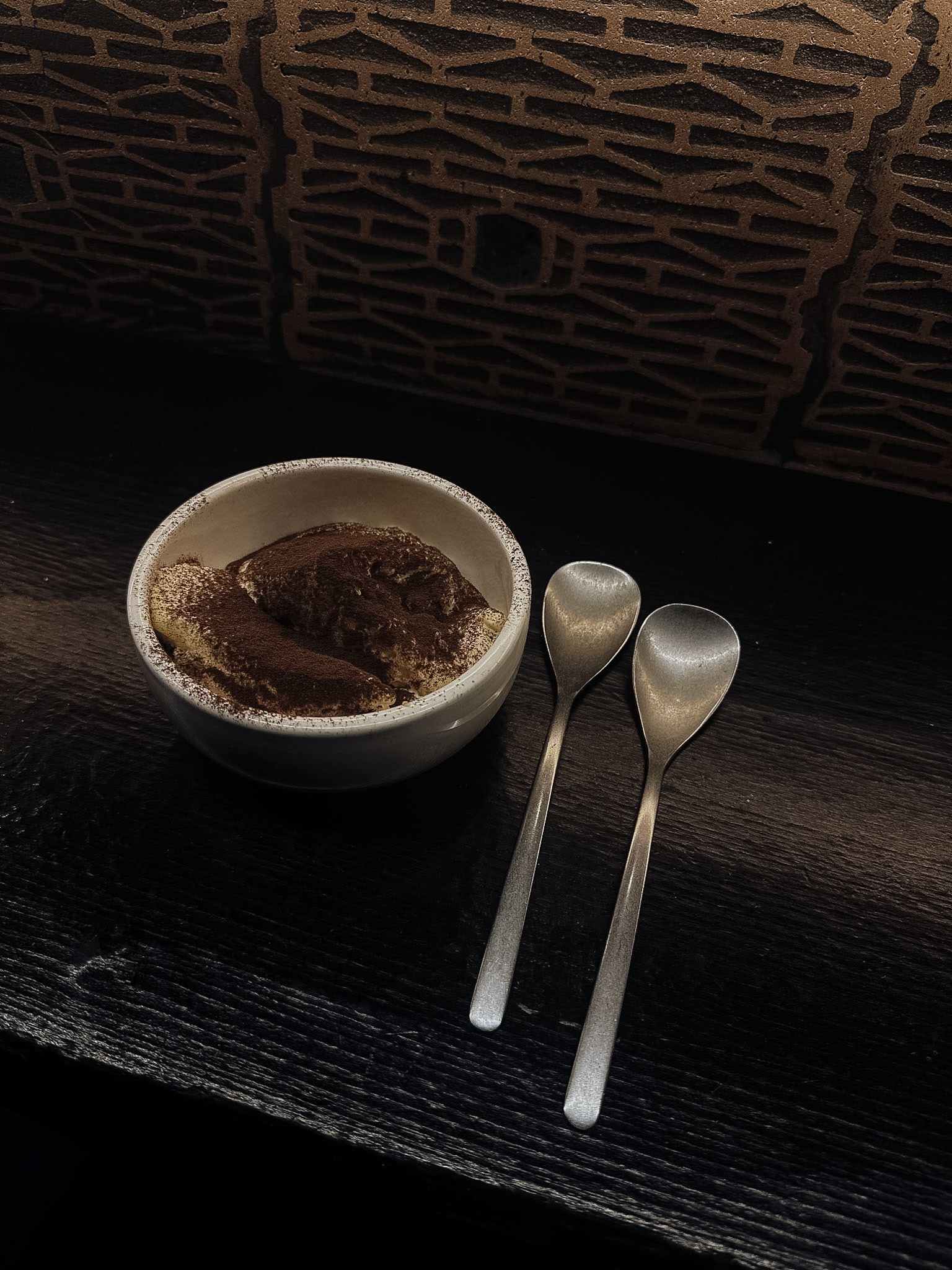 Der Raum ist dunkel, reduziert und sehr bewusst gestaltet: viel Holz, klare Linien, wenig Dekoration. Fast ein bisschen Galerie-Atmosphäre. Das Designkonzept wurde sogar mit einem Architekturpreis ausgezeichnet – und man versteht schnell warum.