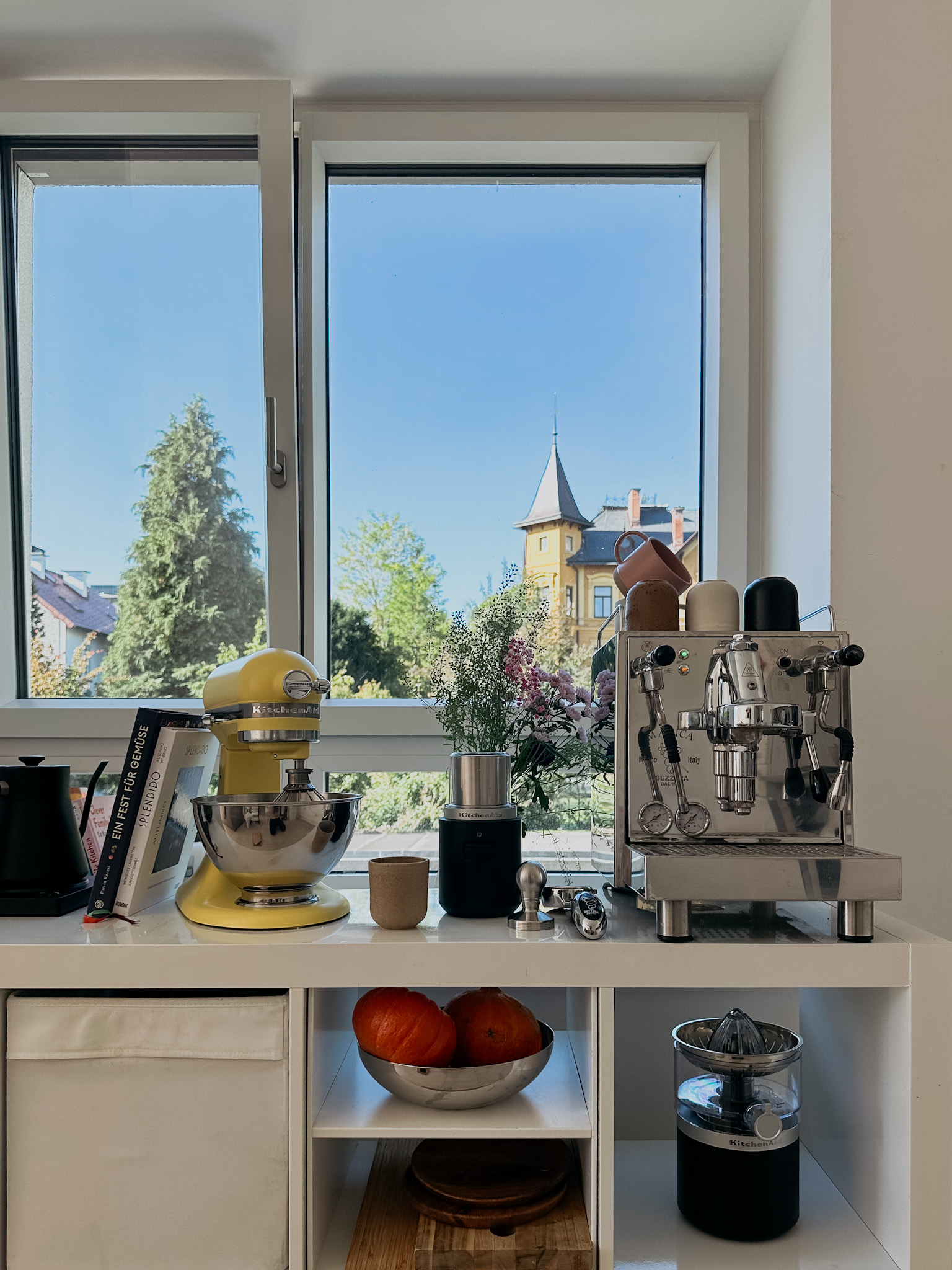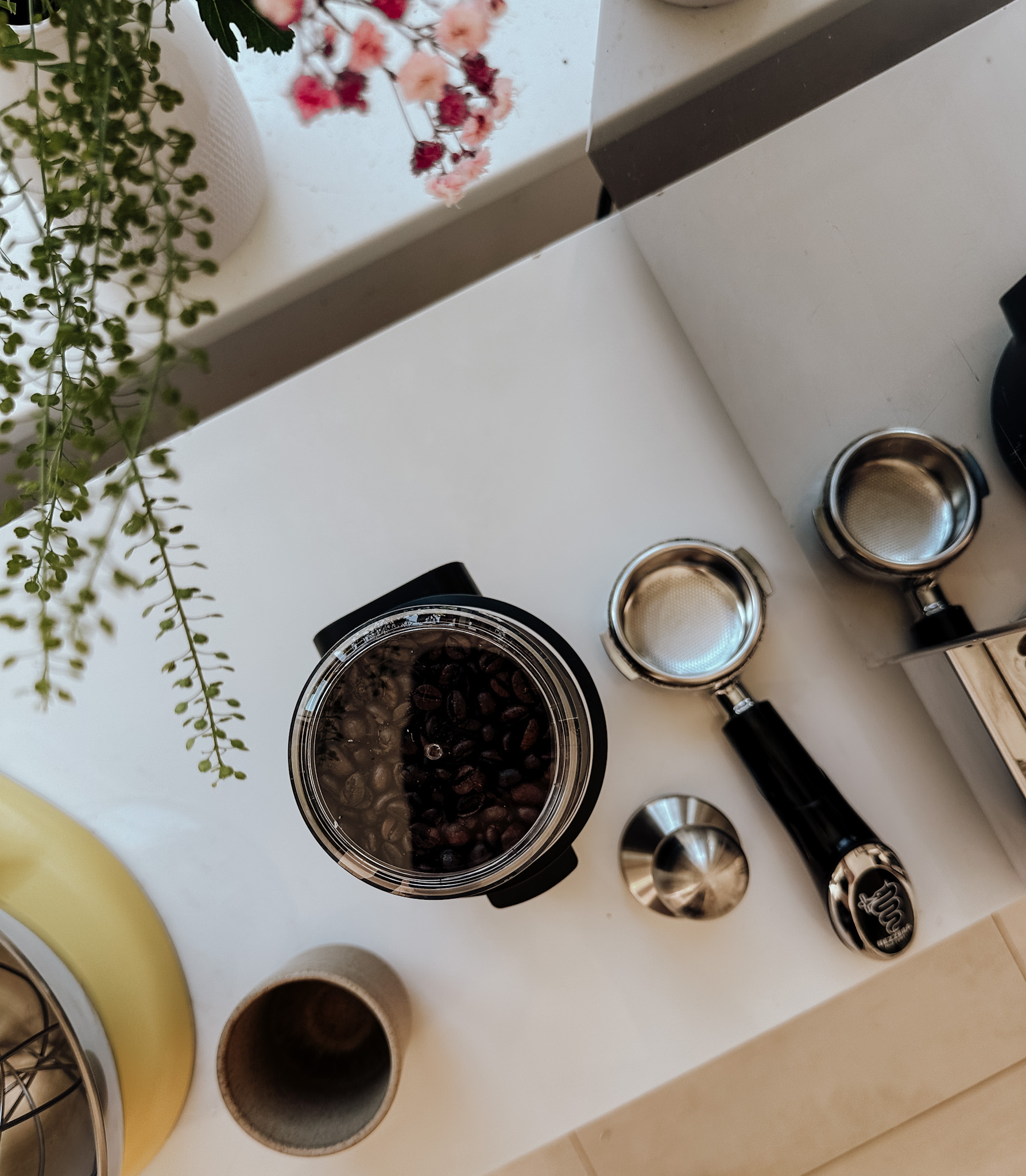 Aktuell benutze ich die kabellose Kaffeemühle von KitchenAid Go Cordless. Sie ist klein, unkompliziert und funktioniert ohne Kabel – perfekt, wenn man mit Baby ohnehin schon genug im Kopf hat. Das Mahlen der Bohnen dauert nur ein paar Sekunden, und der Unterschied im Geschmack ist riesig.